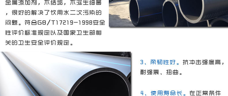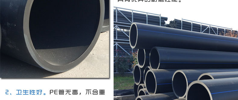 PE給水管內壁光滑,且不隨使用時間變化,摩擦阻力小,節省能源,壓力損失比鋼管約小30%,可選用比鋼管小的口徑。衛生性能好,無添加劑,沒有污染飲用水的可能性,ISO標準定級聚乙烯材料為0級(最低級),不生霉材料,與其他一些常用塑料材料相比,聚乙烯的耐霉菌性能要高很多,長期使用也不積垢。